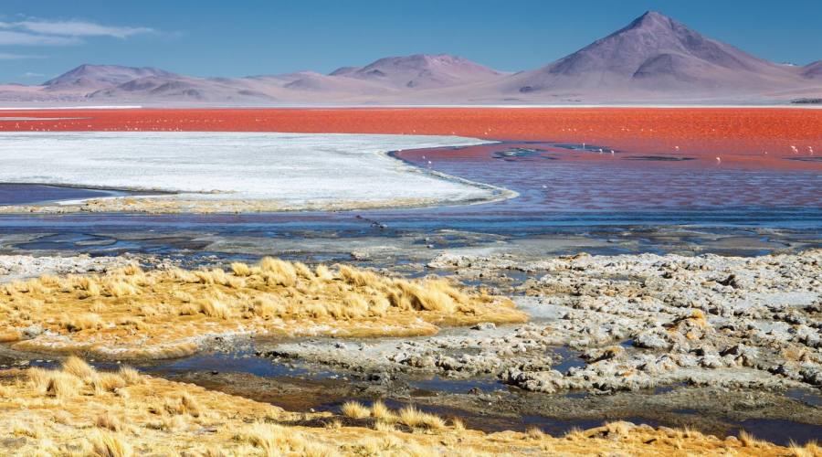 Raggiungerete poi il punto più alto di questo viaggio in Bolivia, i geyser “Sol de Mañana” che si trovano appena sotto i 5000 m. Quindi sarà la volta della Laguna Colorada, con acque rosse e una grande popolazione di fenicotteri, a un’altitudine di 4378 m, ha una superficie più di 60 kmq e una profondità media di soli 80 cm, oltre a isole di borace e ghiaccio al suo interno.